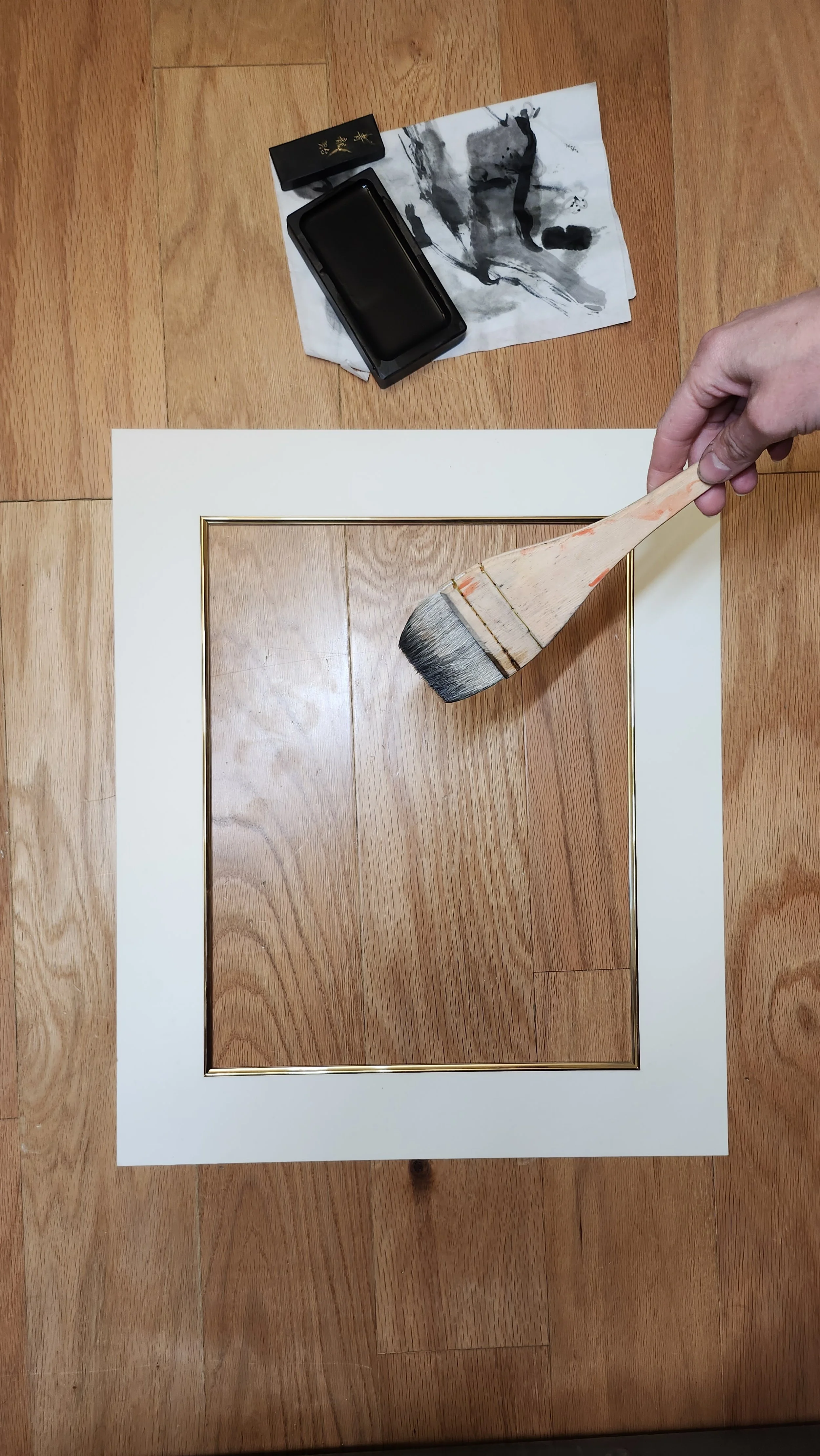 I brushed a sumi ink wash across the old mat board to unify the look with the ink painting. For this one I wanted to try and reuse the mat because the gold trim inspired me to use washi with gold threads for the artwork. In most cases I make a new custom-cut matboard. You can also order custom-cut mat boards at your local framing shop which is significantly more affordable that a full custom frame job.
